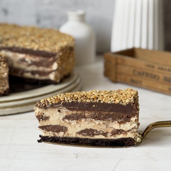 Два слоя насыщенного шоколадом брауни с прослойкой из ореховой нуги. Торт покрыт плотным слоем мягкой, слегка солоноватой карамели с орехами.
