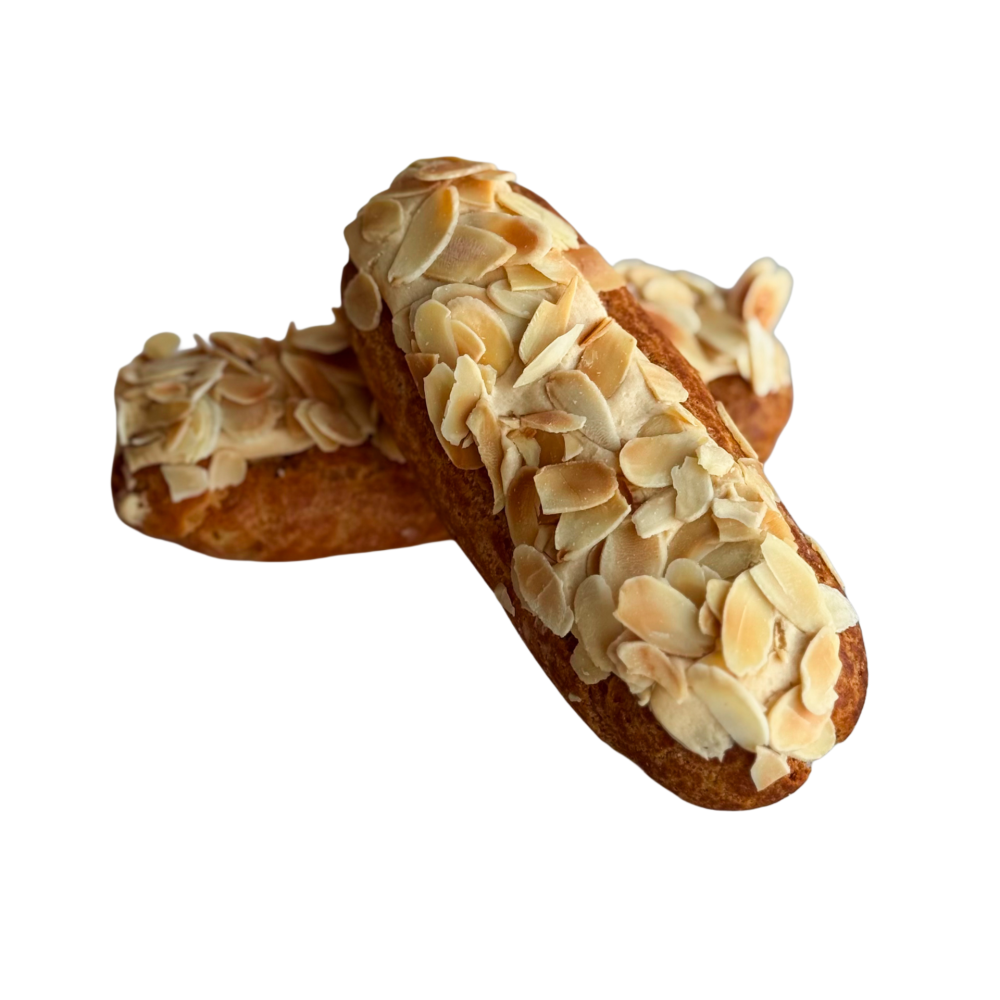 Карамельный эклер с кремом из взбитых сливок с карамелью, украшенный лепестками миндаля