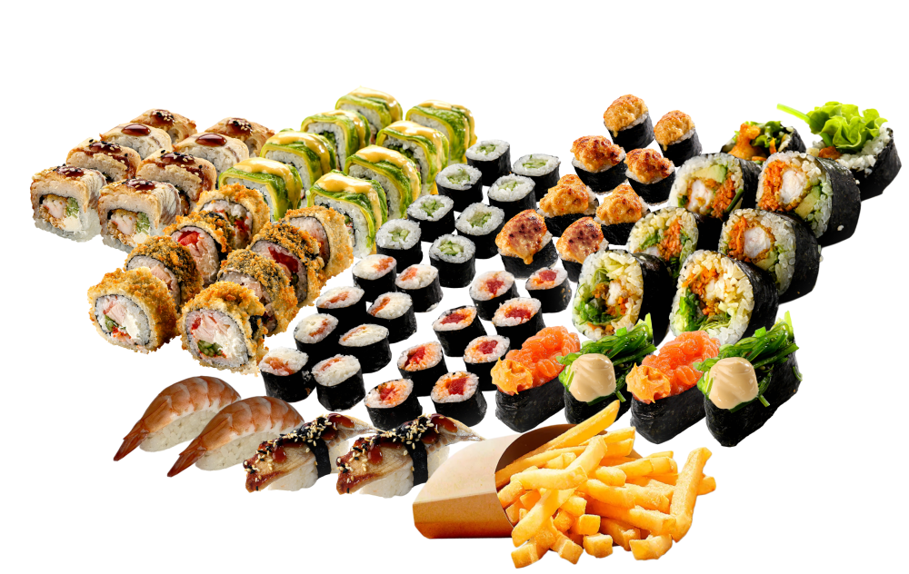 Краб авокадо, Креветка темпура с угрем, Запечённый курица в нори, Жареный ролл с курицей, Кимпаб умами, Маки лосось сыр, Маки огурец, Маки тунец спайси, Суши креветки 2 шт, Суши угорь 2шт, Картофель фри, Гункан чука 2шт, Гункан лосось 2шт